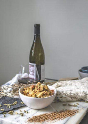 millet - fond de légumes ( poireau-céleris-carotte-tomate ) - poulet - oignons - tomates - lait de coco - beurre - pâte de tomates - gingembre - ail - épices ( garam masala - curcuma - cannelle ) - huile de canola - sel - poivre - persil.