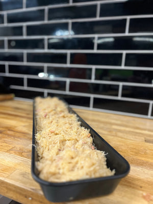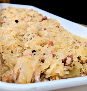 Choucroute assaisonnée au baie de genièvre, aux lardons et au vin orange du Québec garnie de saucisses fumée et de rôti de longe de porc.